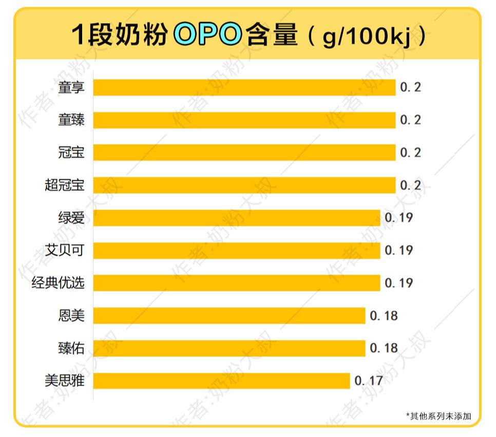 OPO结构脂也叫做1,3-二油酸 2-棕榈酸甘油三酯,如果是容易便秘的宝宝,可以考虑这种配方。市面上所有的配方奶粉大约只有1/3添加了OPO。和1段一样,贝因美这次横评的17个系列奶粉中,只有10个系列配方里添加了OPO结构脂。其中,只有超冠宝2段、冠宝2段、童臻2段、童享2段的含量在市售多数奶粉中排在中上位置。